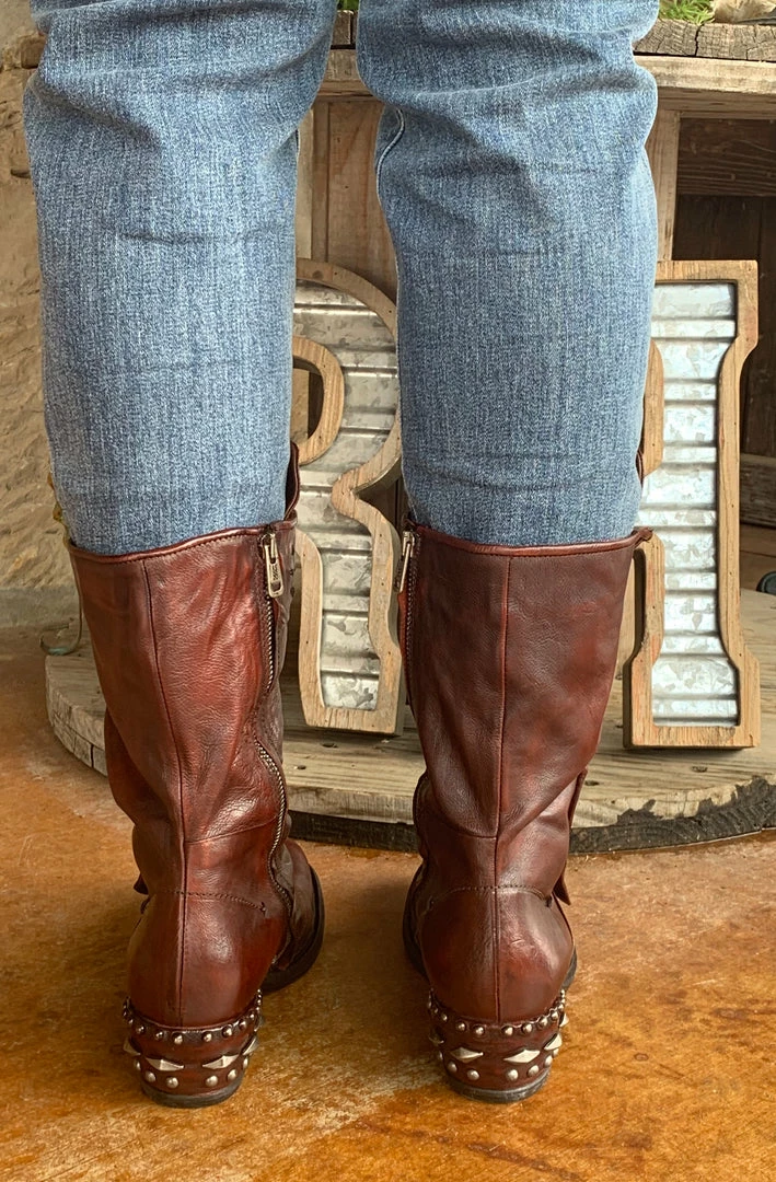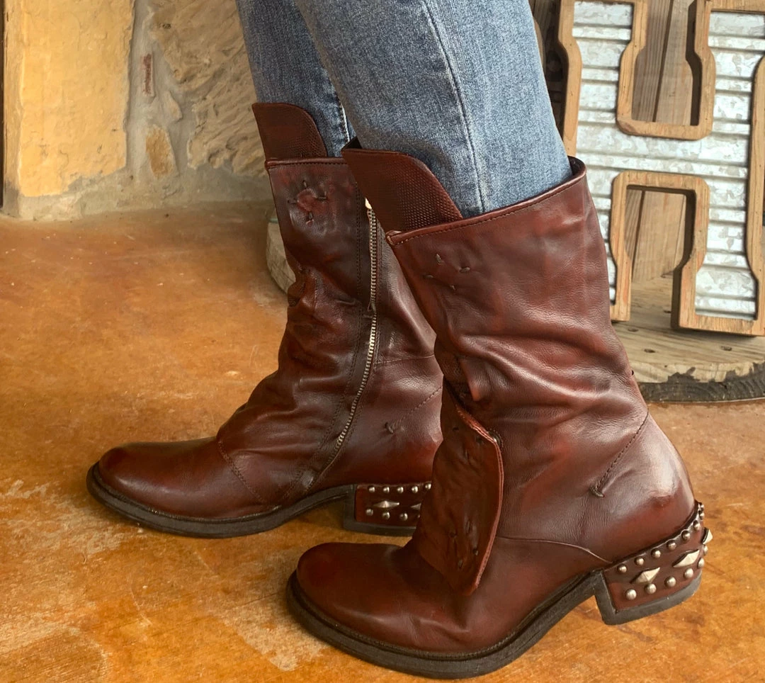 These have a full zipper going up the side, 4 working buttons on the tongue of boot to extend size, and has silver detailing around the back of boot. These are true to size!!
