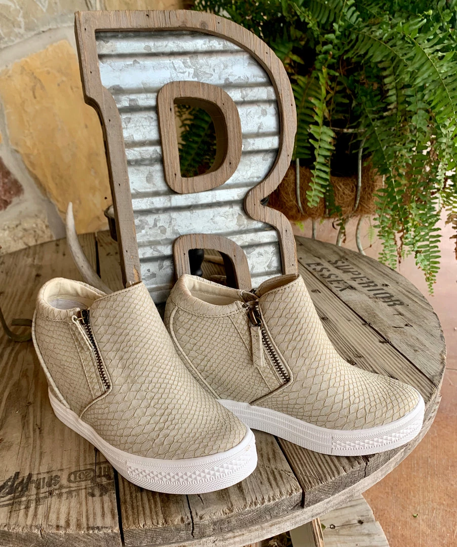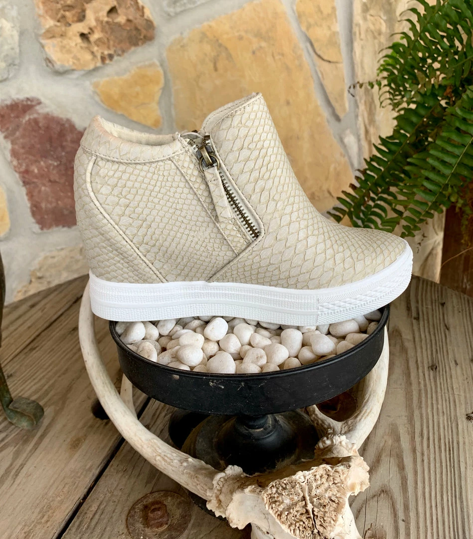 These hidden-wedge sneakers are perfect to pair with any outfit! They feature a cream snake print and zip up on both sides.