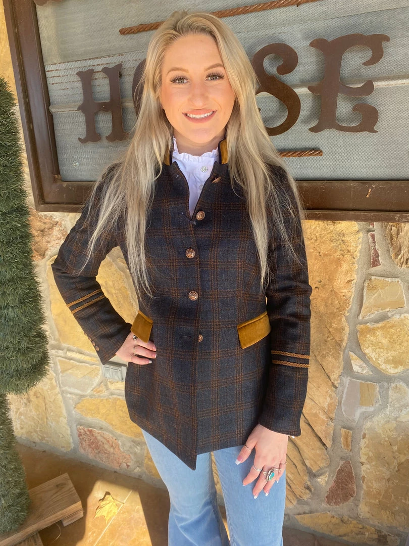 Stunning dark blue plaid blazer by Tinta Style. It features bronze button up front with velvet front pockets and collar. This would be perfect paired with a pair of slacks or a pair of skinny jeans.
