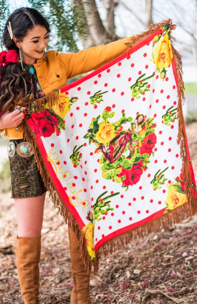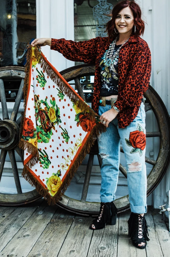 100% silk wild rag. You can use it as a scarf, shawl, tie it around your waist or even as a bandana. It’s the perfect statement piece!