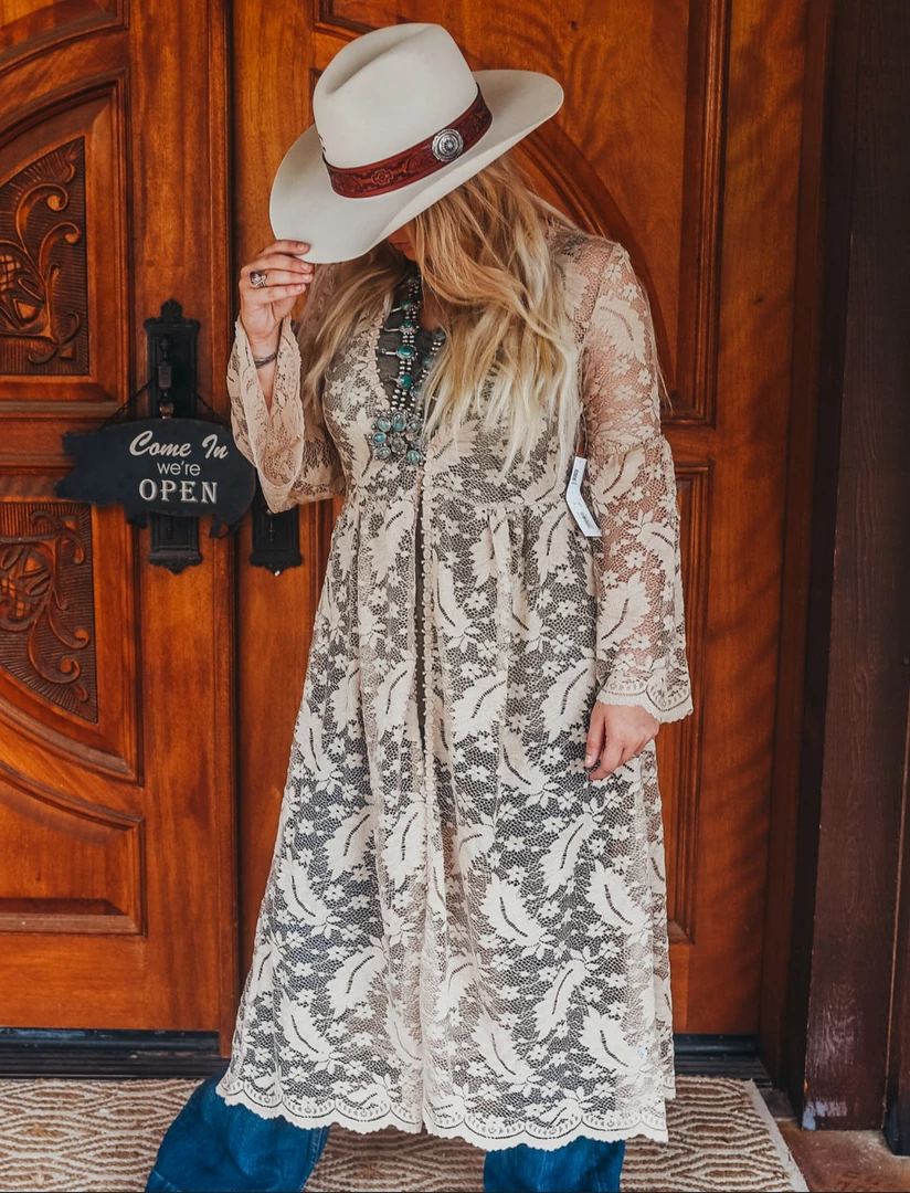 You’ll soar to new heights in this Scully Boho Lace Duster. It will dress up any outfit with its intricate floral leaf design and cool feminine appeal.
