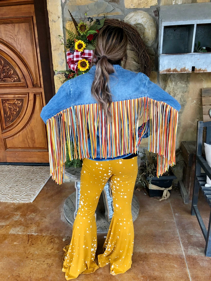 - This traditional jean jacket takes on a new vibe with its colorful playful long fringe.