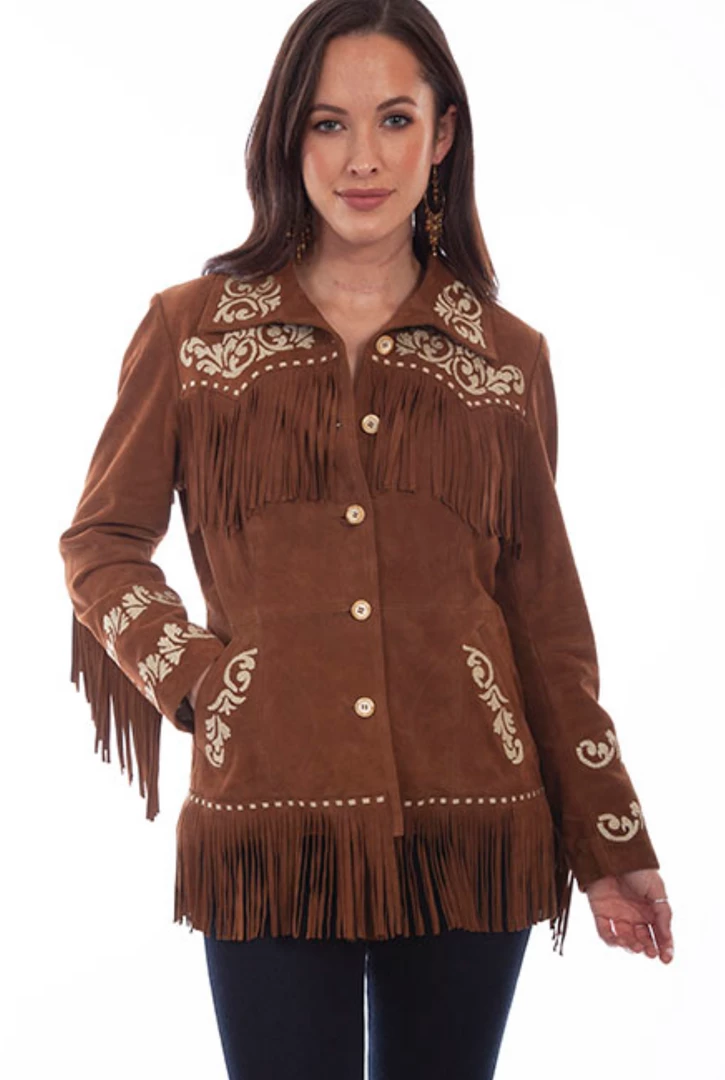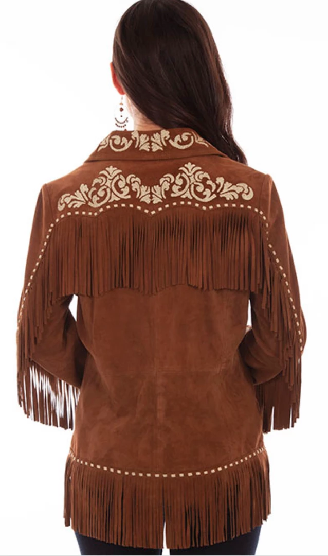 This beautiful jacket by Scully is a luxurious suede with a 5 button closure down the front. It features tan embroidery and stitching on the front and back, and finishes the western look with soft fringe.