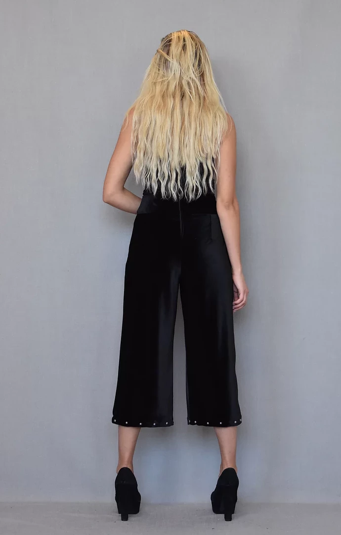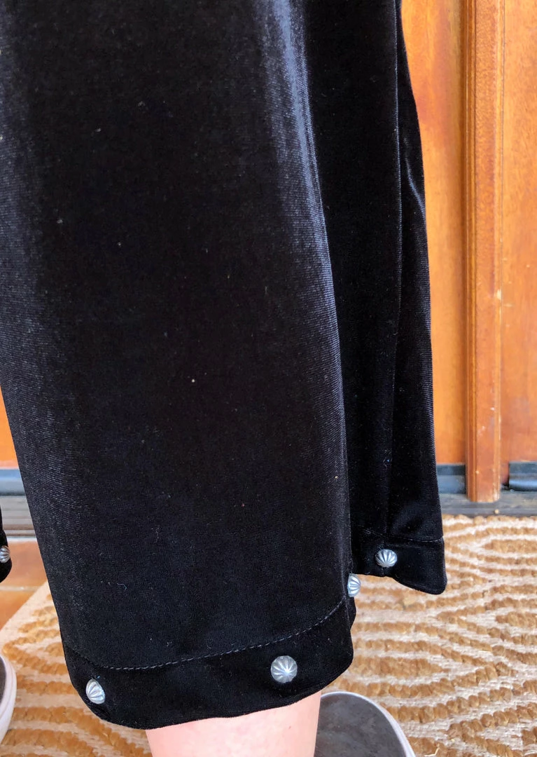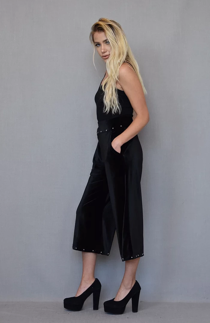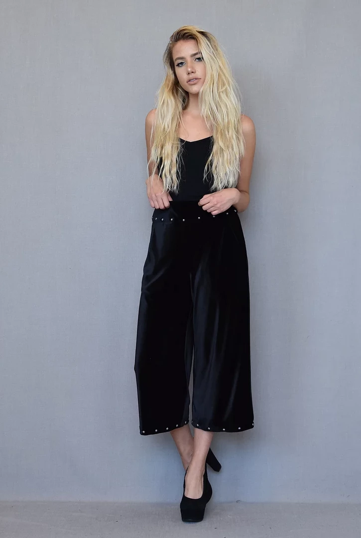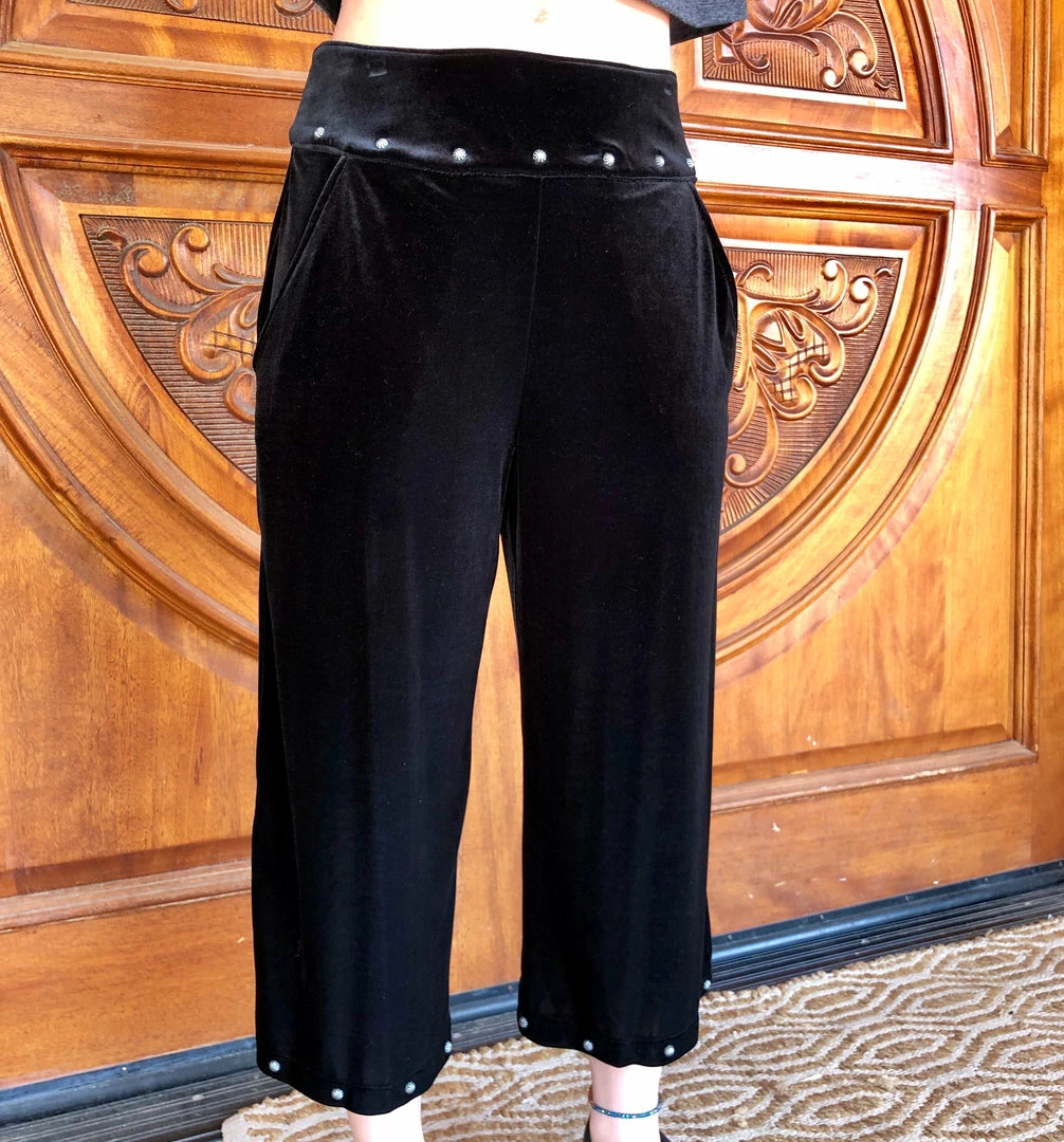 These soft velvet palazzo pants feature front pockets, small concho stud detailing on the bottom and waistline, and a 6″ back zipper. They are high waisted, and a great relaxed fit!
