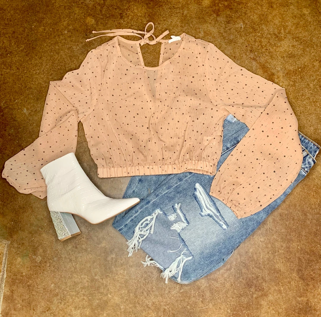 Star Gaze Crop Top is a must have! Star print is EVERYTHING right now! This top is a taupe sheer crop with black stars throughout. It has balloon sleeves, elastic waist, and a keyhole tie in the back.