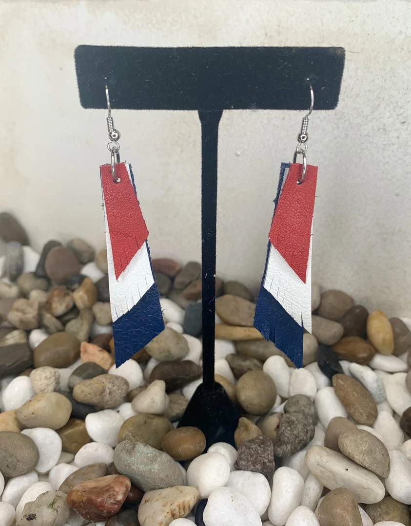 These earrings were handmade right here in Oklahoma! They feature 3 layers of red, white, and blue. They are 4″ in length.