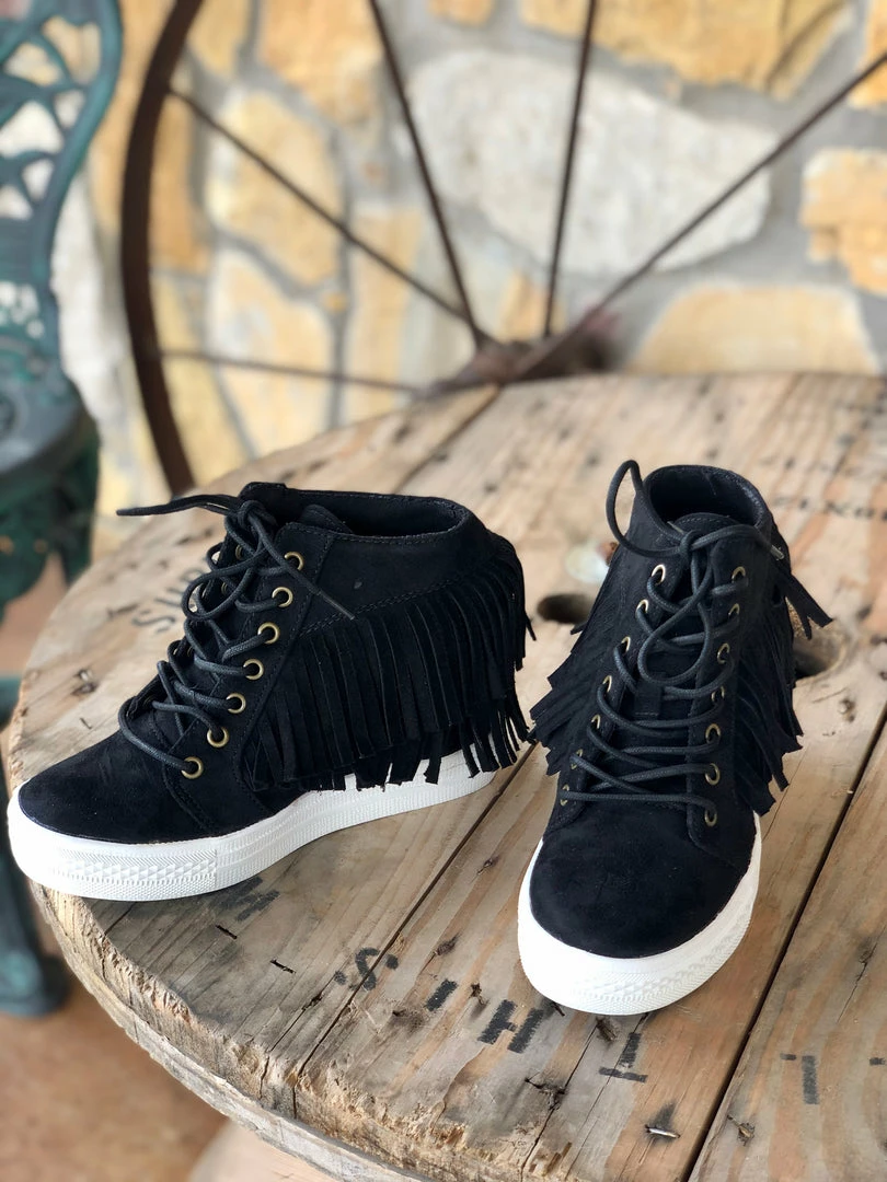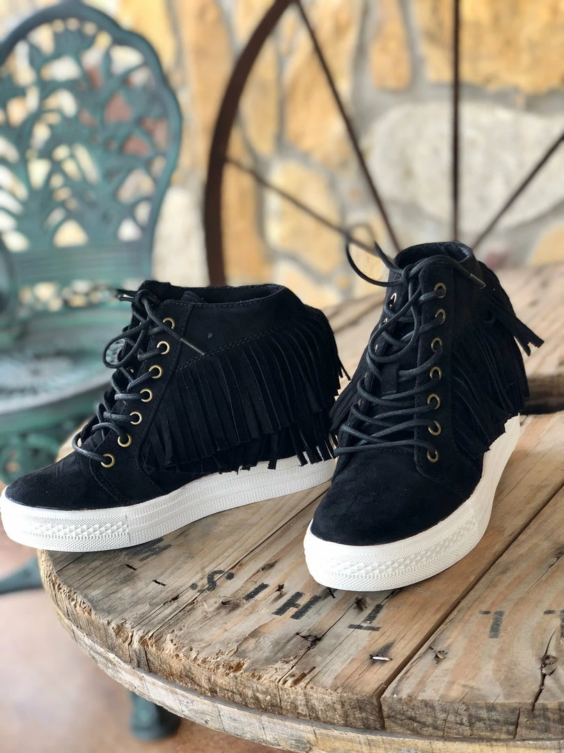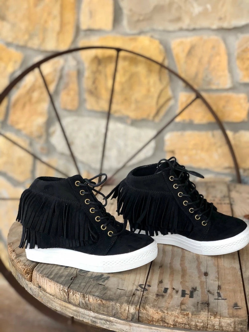 These booties feature a suede feel with a front lace up and rubber sole! They also have two layers of super cute fringe with a wedge inside and a thick rubber sole!