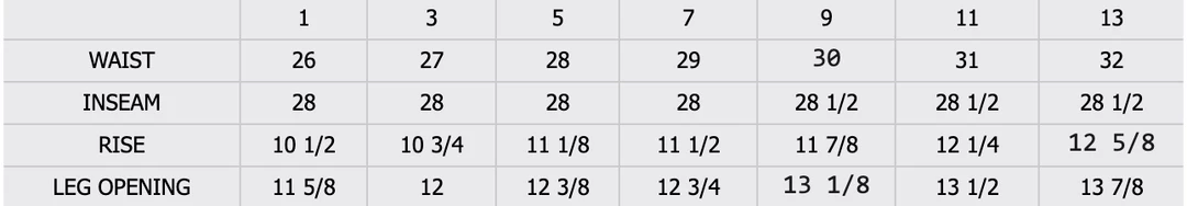 Inseam: 28” Rise: 10 3/4”