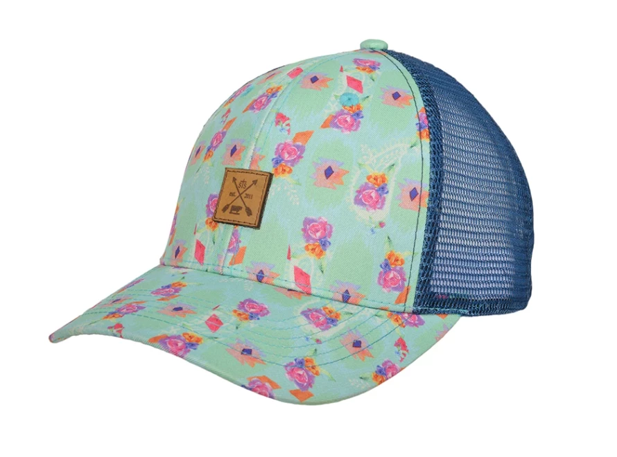 STS Ranchwear teal patch cap with flower design and an adjustable plastic snap backstrap.