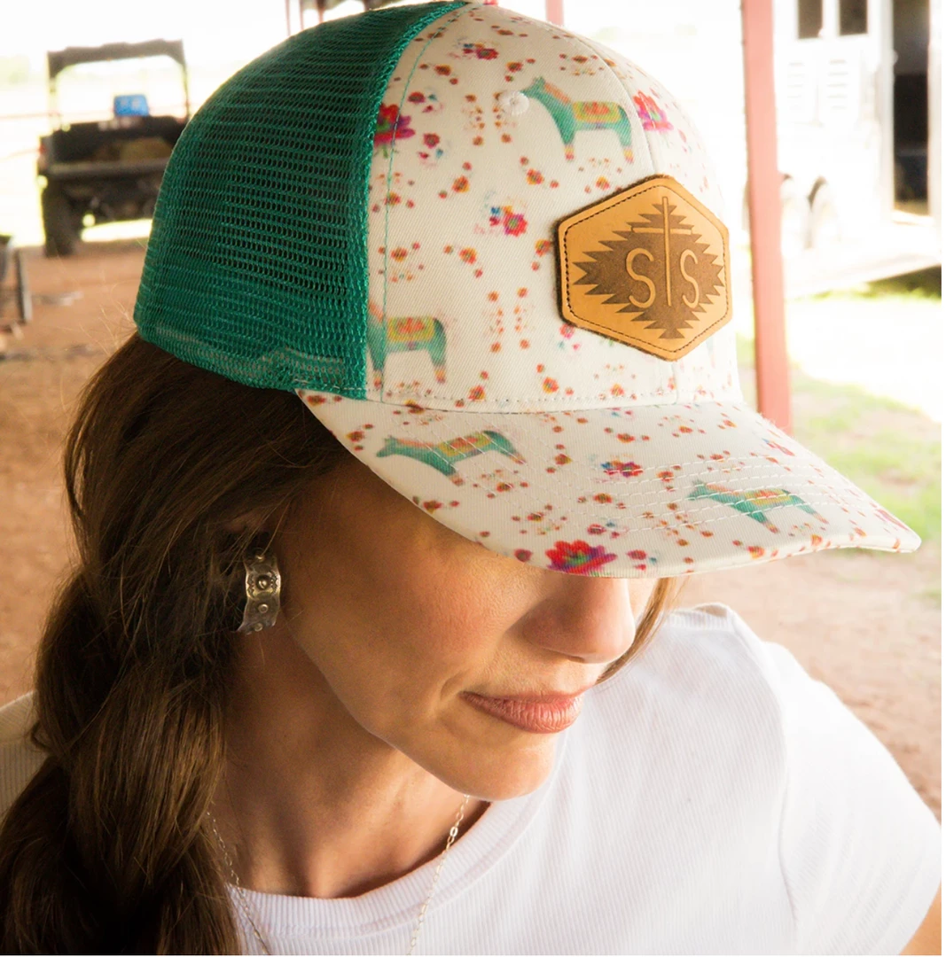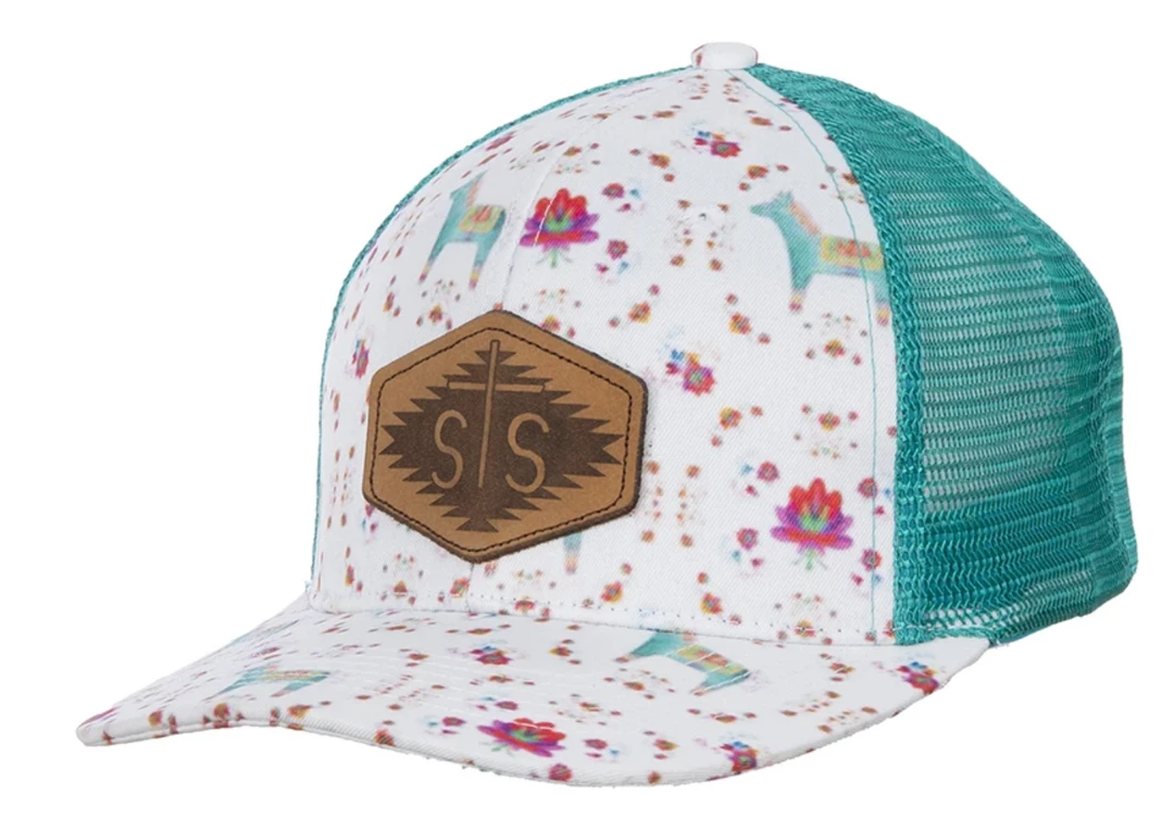 STS Ranchwear watercolor donkey cap with STS patch and an adjustable plastic snap backstrap.