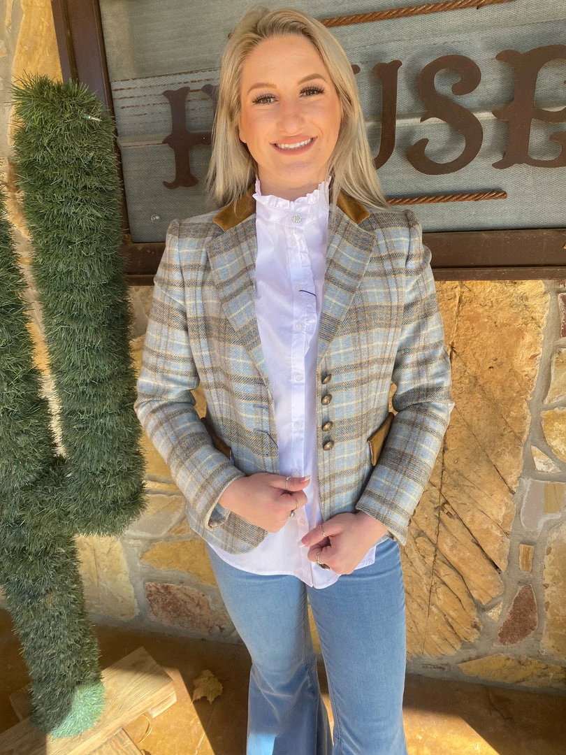 The Marte is a stunning jacket by Spanish label Bariloche from the new Autumn collection at Ribbon Rouge. This fabulous fitted jacket is made in a beautiful elegant light blue/grey and cream tweed print with mustard brown pocket & lapel details. This beautiful jacket is finished off with intricate gold buttons on the front and sleeves! The perfect statement piece for transitioning into Autumn.
