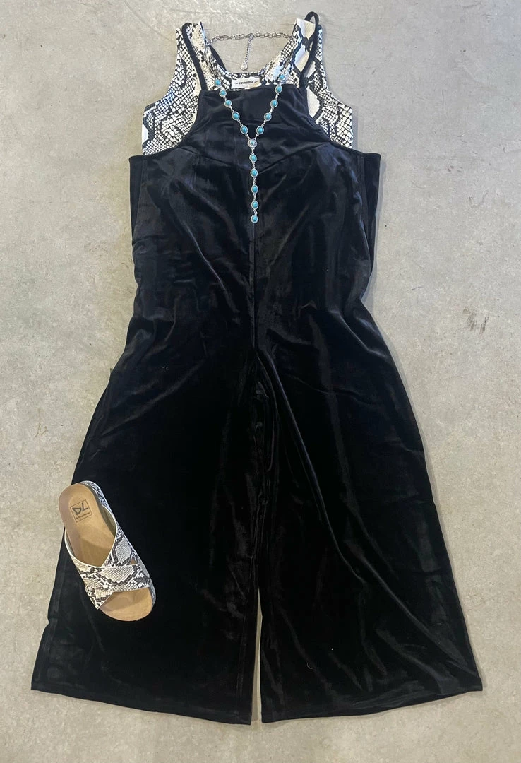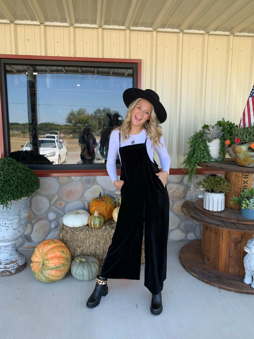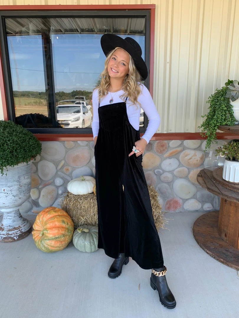 This cute velvet, wide leg romper is a perfect comfy cute outfit.