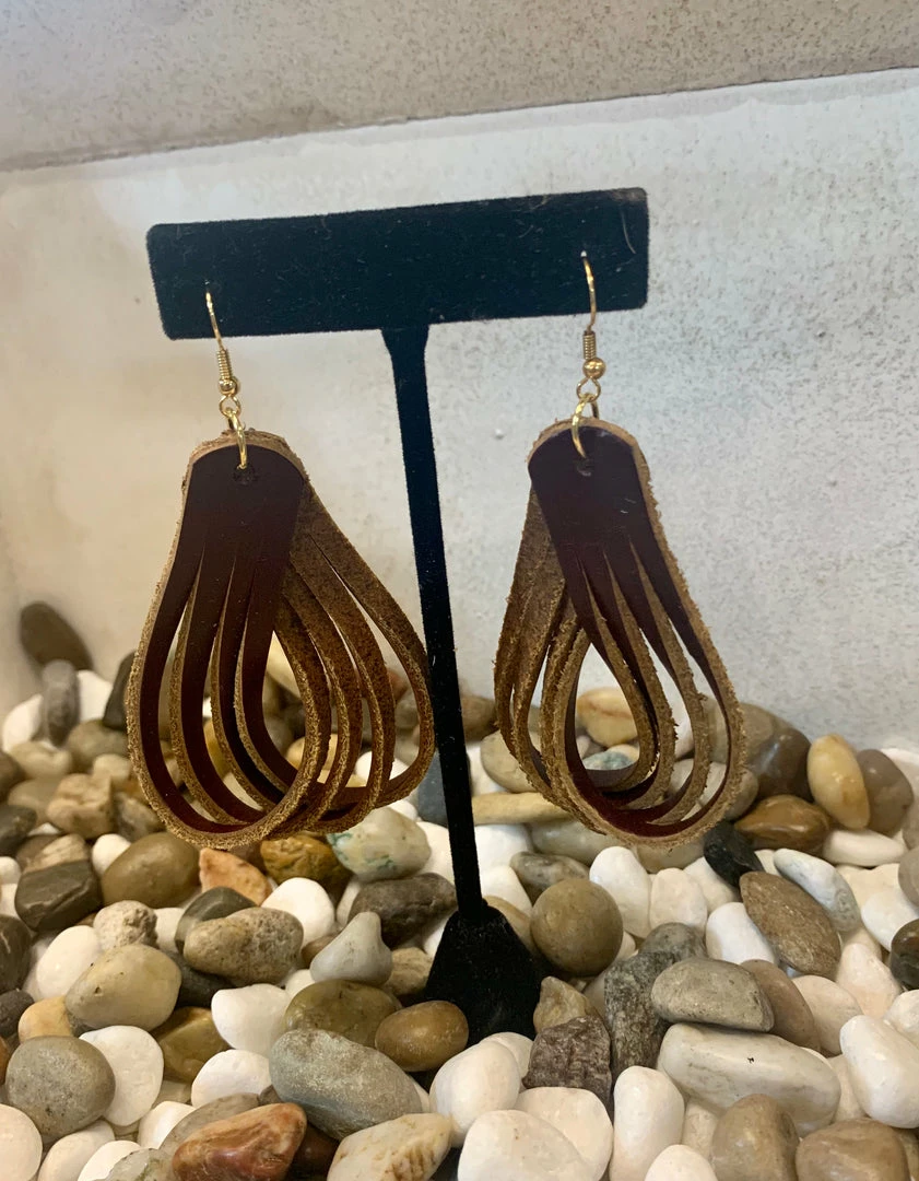 These earrings are the perfect addition to any outfit. They are brown leather loops and are 3 1/2″ in length.