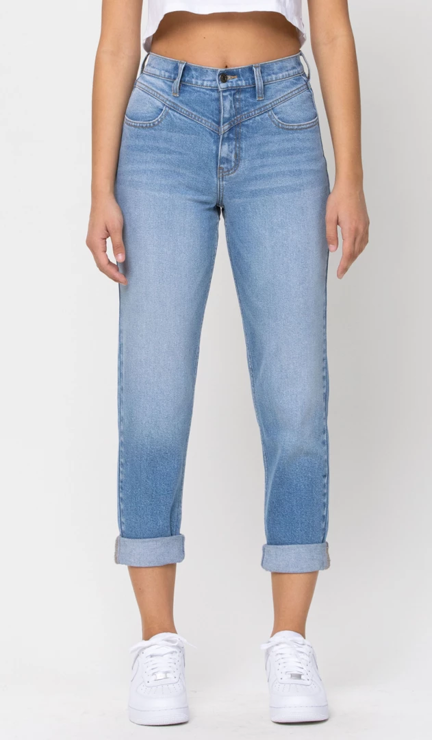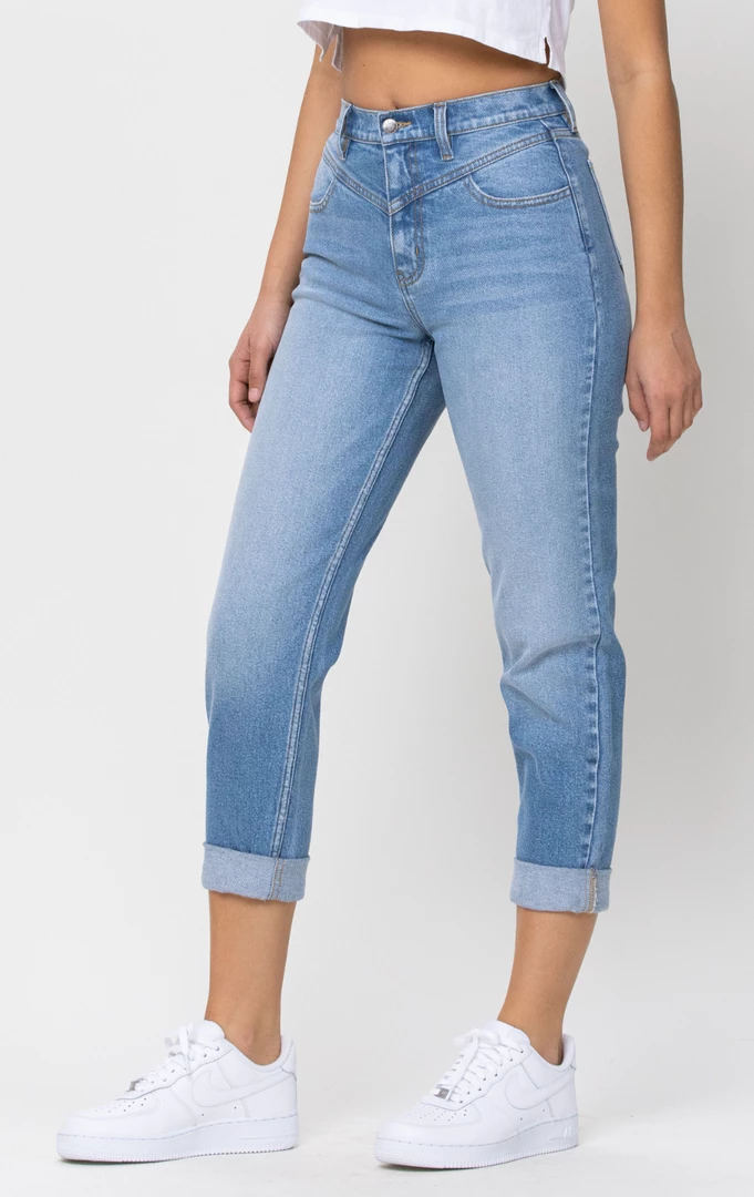 Our Go Ask Your Mom Jeans come with a sweet little flashback. Check out yoke on them! They feature cuffed bottoms, working belt loops, and front and back pockets. They do have stretch for your comfort!