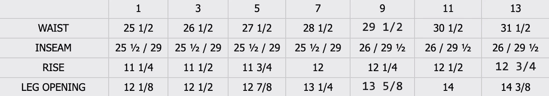 Inseam: Rolled 25 1/2” Total 29” Rise: 11 1/4”