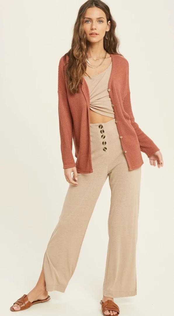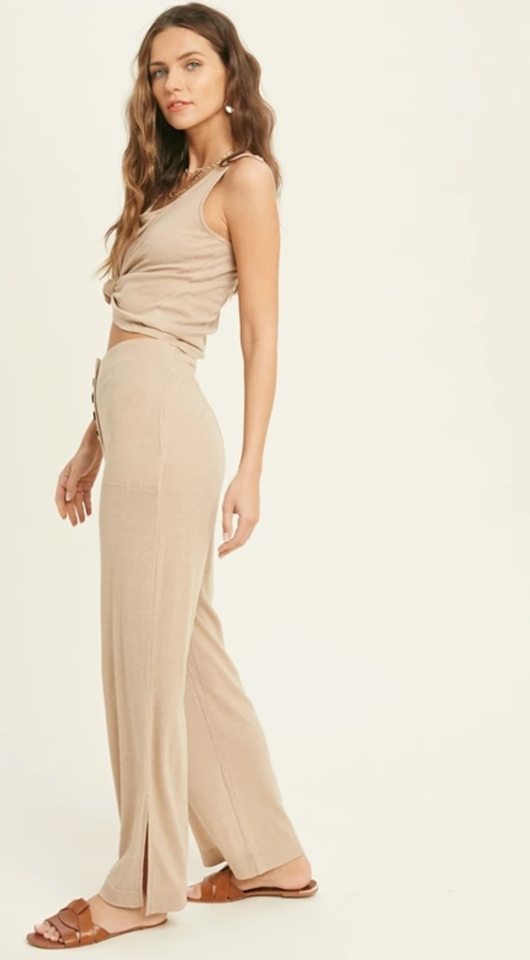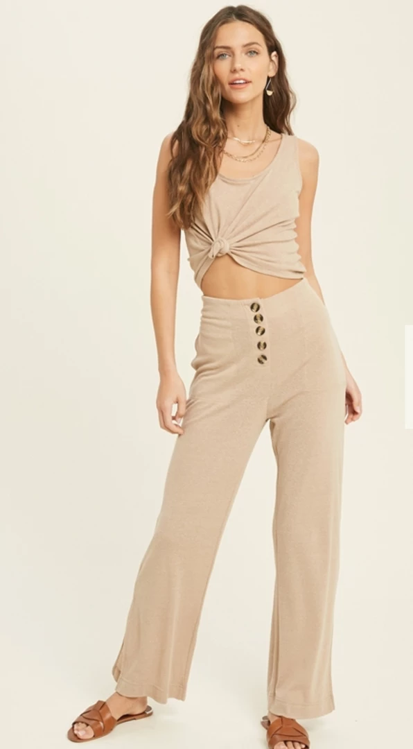 LOUNGE 2PCS SET – SCOOP NECK – SLEEVELESS – CROPPED LENGTH – ELASTICIZED WAISTBAND – FAUX BUTTON PLACKET DETAILING – PATCH POCKETS – SIDE SLITS – WIDE LEGS – RELAXED FIT