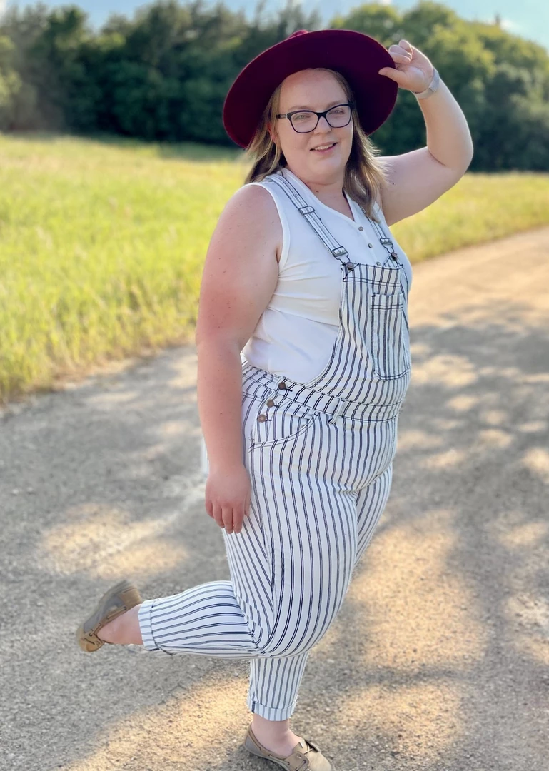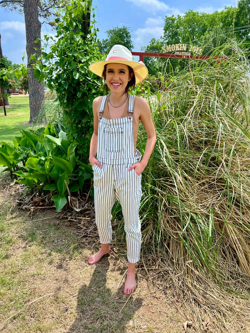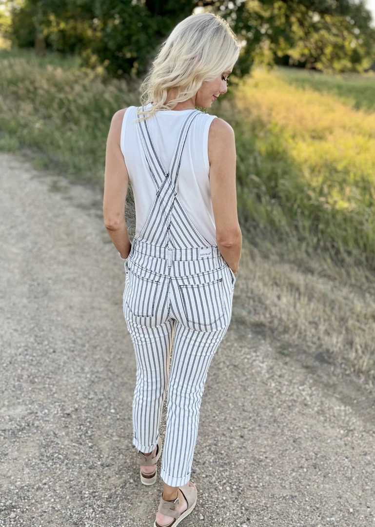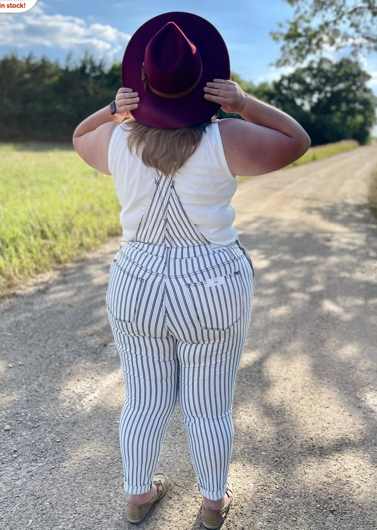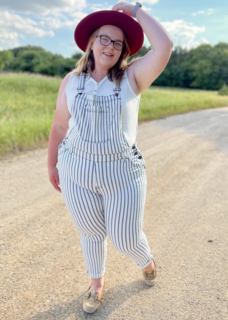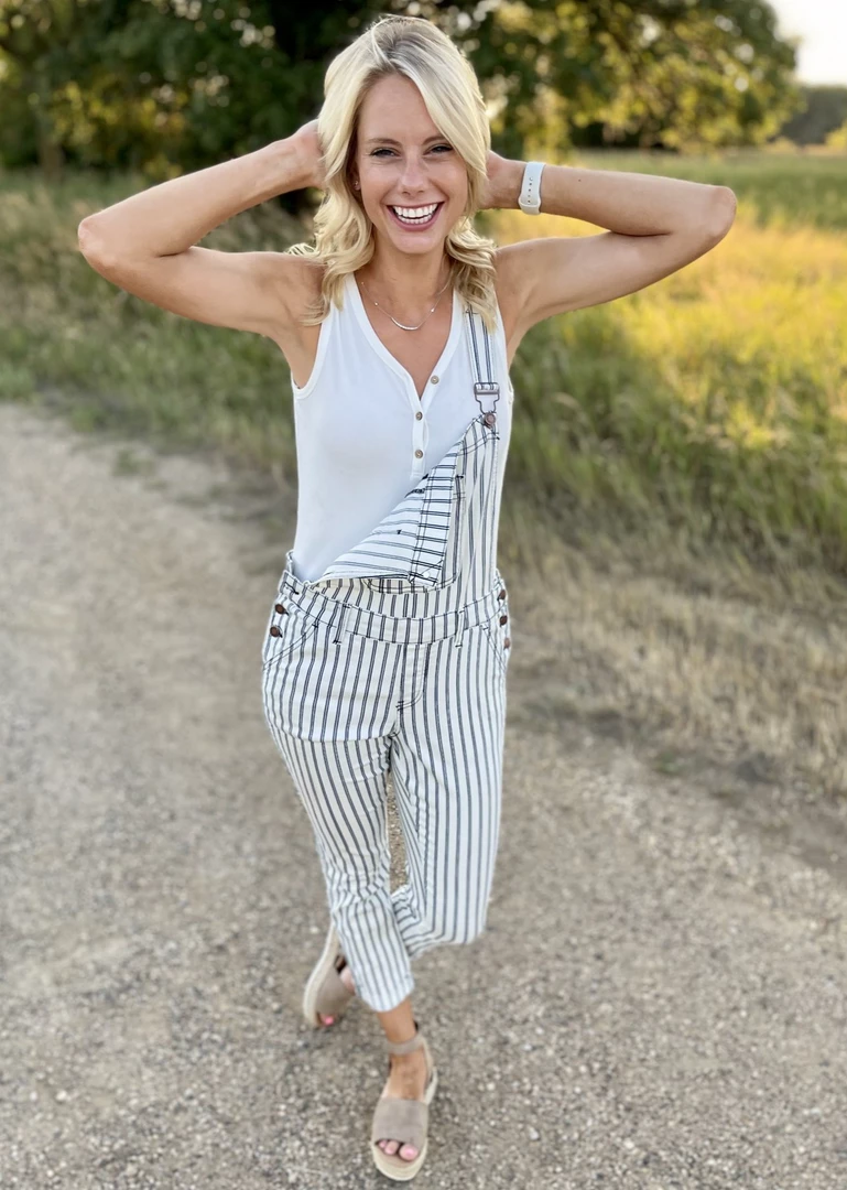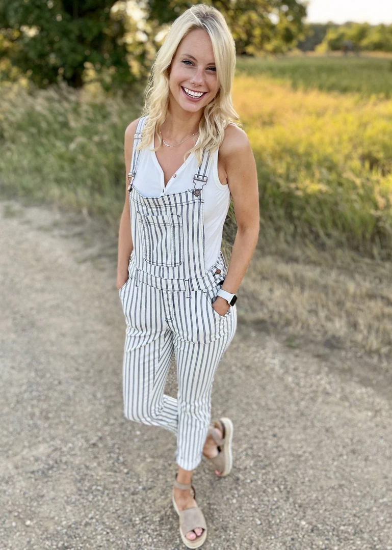 Our Take The Train Overalls are the best!! Featuring an amazing fit, super soft denim, dark navy pinstripes, skinny cuffed leg, pockets, and did we mention…the BEST FIT?! Seriously, these are GOLD!! Pair them with a white button up or colorful tank! These overalls are beyond versatile, classy, and adorable!