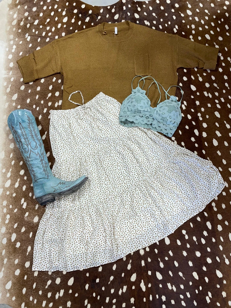 This classic tea length skirt is absolutely to die for! It is cream color with little dainty flowers.