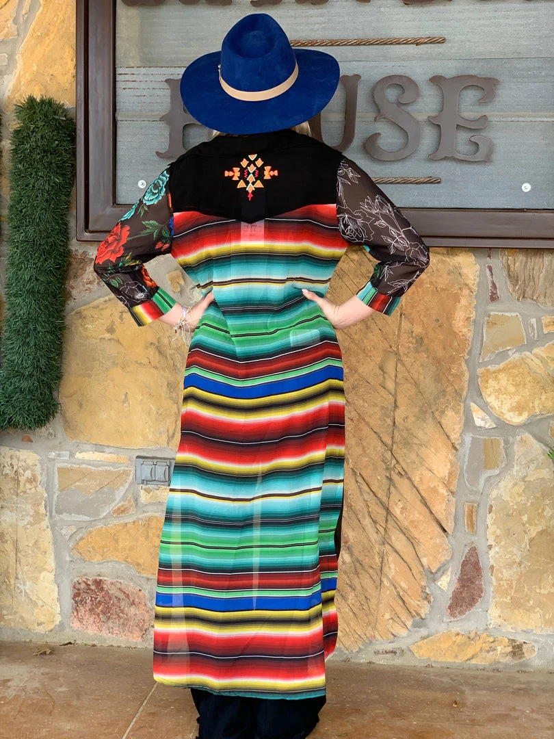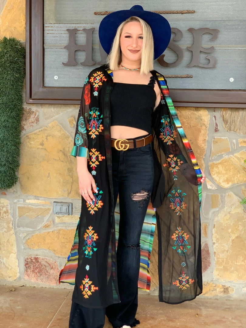 This sheer long duster is great to give you a little spice i your step! Its brightly colored sarape back and floral sleeves, with a touch of embroidery is gorgeous on the eyes! Hand women and made with love!